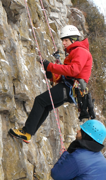 • Lesson 11 Seconding climber ascends on rope over a difficult section of the route.